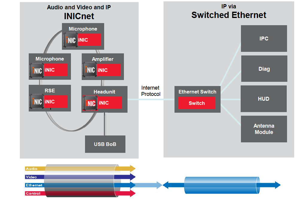 INICnet은 오디오, 비디오, 컨트롤 및 이더넷을 포함한 모든 데이터 유형을 단일 케이블로 지원하는 자동차 인포테인먼트 네트워킹 솔루션이다. INICnet을 적용한 자동차에서는 여러 소스와 싱크가 있는 디지털 오디오 형식을 지원하는 유연성, 파일 전송 및 OTA(Over-The-Air) 소프트웨어 업데이트, 표준 이더넷을 이용해 시스템을 진단할 수 있는 고속 패킷 데이터 통신을 제공한다.