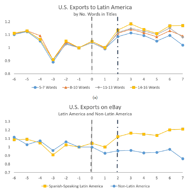 이베이의 인공지능 번역 시스템 eMT를 적용하기 전후의 영어권과 비영어권인 라틴아메리카의 매출(수출) 증가 변화 추이. 위의 그래프는 제품 제목의 길이에 따른 매출의 변화, 아래 그래프는 인공 지능 번역 서비스를 제공하기 전과 후의 전체적인 매출 변화를 비교했다.(자료:'Does Machine Translation Affect International Trade?’ 논문 발췌)