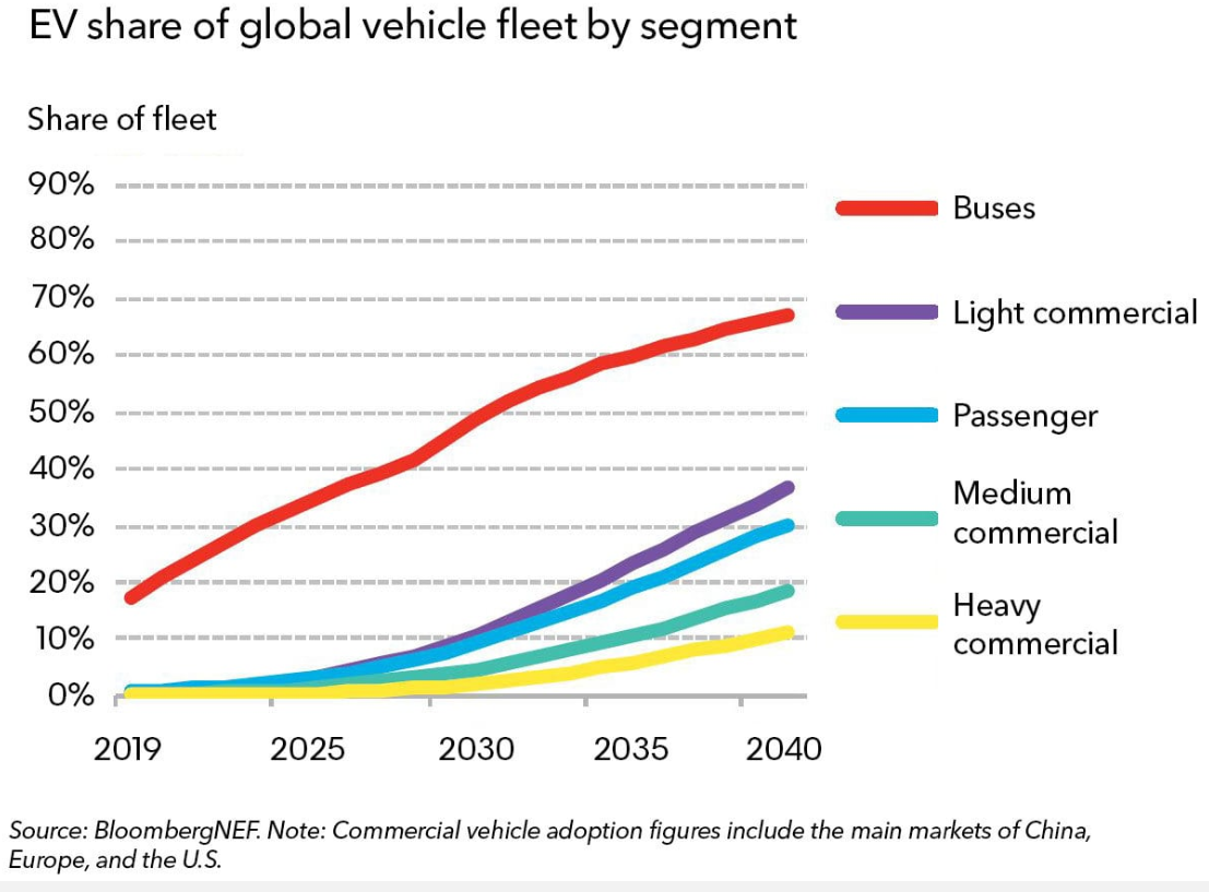 전기차의 성장은 사람을 태우는 승용, 승합, 버스 등에서 꾸준하게 이어질 것으로 보인다. 하지만 트럭의 경우는 2040년 전기차 비중이 19%로 상대적으로 낮을 것으로 전망했다. 하지만 이마저도 주로 단거리 운송용 트럭에 국한된 것으로, 장거리를 운행하는 트럭은 천연가스나 수소 연료 전지 등의 대체 연료를 사용하는 비전기(non-electric) 모델들과 경쟁을 하게 될 것이라고 전했다.