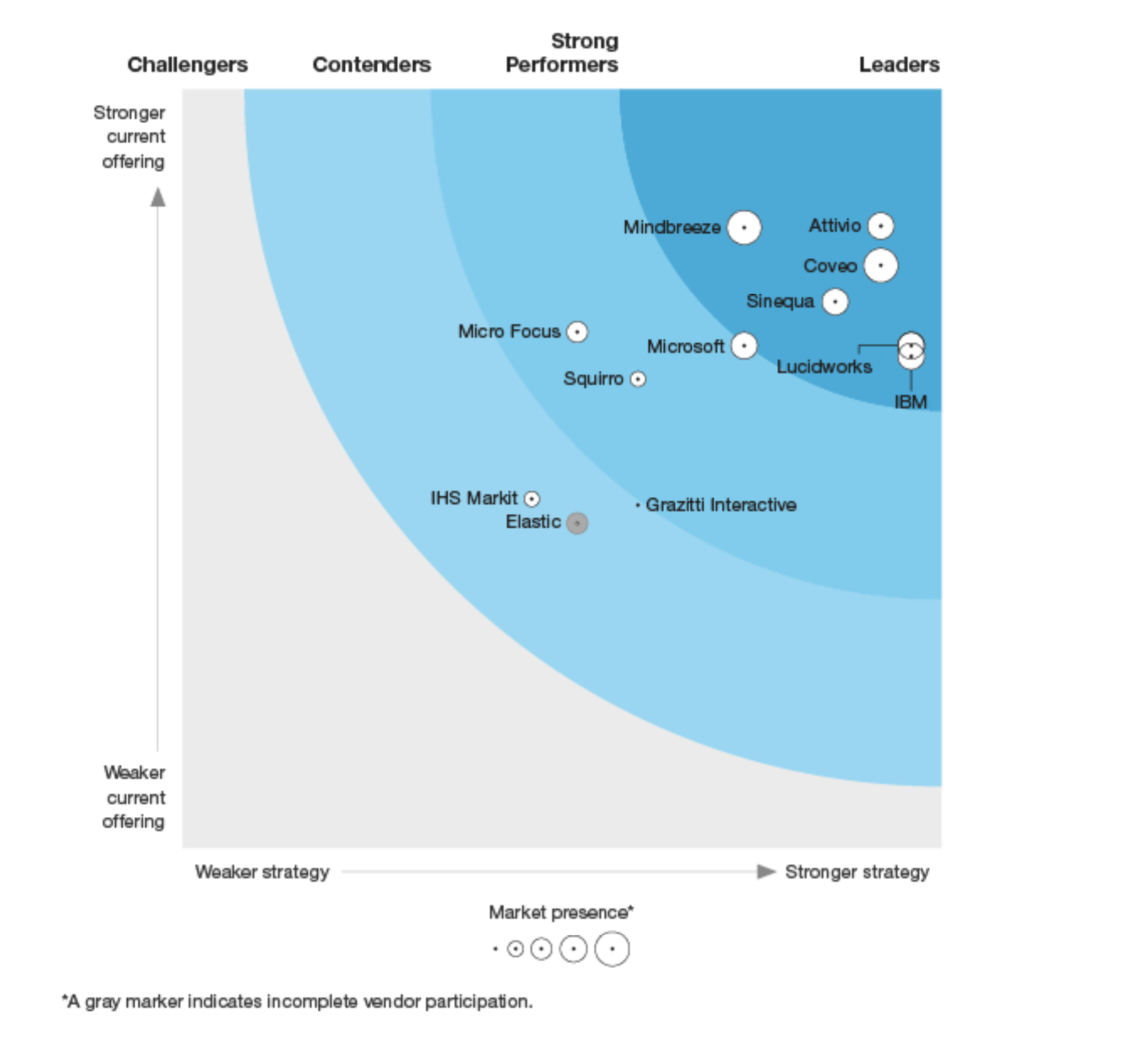 시장조사기관 포레스터 리서치(Forrester Research)가 발간한 '2019년 2분기 포레스터 웨이브: 코그니티브 서치(The Forrester Wave: Cognitive Search, Q2 2019)’ 보고서에서, 제품 로드맵/고객서비스/전반적인 실행력 및 커뮤니티 부문 최고 점수를 획득하며 리더로 선정됐다.(자료:포레스트 리서치)