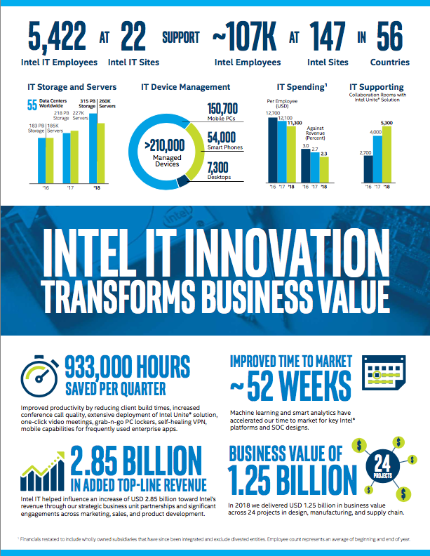 인텔이 이러한 내용을 골자로 하는 2018-2019 인텔 IT 연간 성과 보고서를 공개했다. IT 연간 성과 보고서는 인텔이 지난 1년간 자사의 IT 혁신 내용을 담은 보고서로, 데이터 중심 기업으로 전환하기 위해 공급망부터 판매 조직에까지, 디지털 트랜스포메이션 전략을 수립하고 추진하는 데 핵심적인 역할을 하고 있는 인텔 IT팀의 노력과 성과를 담고 있다.