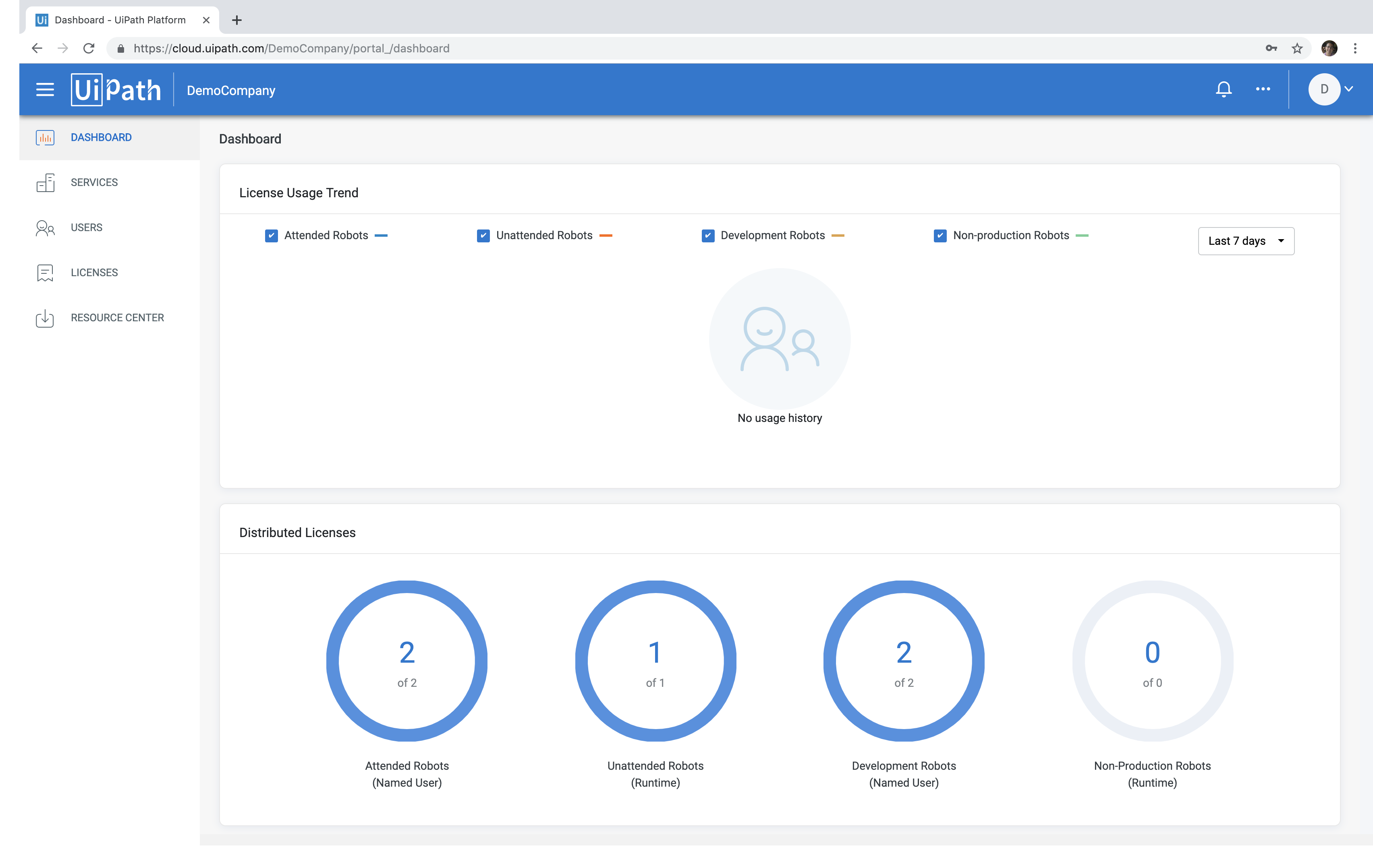 유아이패스 RPA 클라우드 플랫폼 대시보드 화면. 유아이패스 클라우드 플랫폼의 프리뷰 버전은 현재 무료로 사용 가능하며, 어탠디드 로봇 2개, 언어탠디드 로봇 1개, 개발 로봇 2개가 제공된다. 공식 출시는 2019년 4분기로 예정되어 있다.(화면:유아이패스)