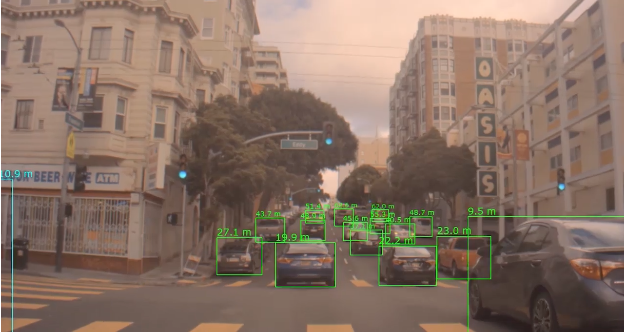 하나의 카메라로 촬영한 2D 영상을 DNN과 컨볼루셔널 신경네트워크를 활용해 학습시키면, 다양한 도로 환경에서 다른 자동차나 보행자와의 거리를 예측하고 추정하는 데 정확도를 높일 수 있다.(동영상:엔비디아 블로그)