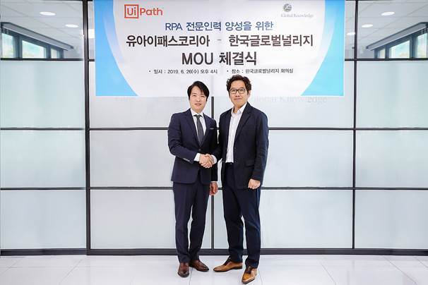 유아이패스코리아가 한국글로벌리지와 RPA 전문가 양성을 위한 업무협약(MOU)을 체결했다. 이번 업무협약을 통해 양사는 다양한 교육 수요 분석을 통한 특화된 교육과정을 개발해 전문적인 RPA 인력을 양성하는 데 힘을 모으게 된다. 이를 위해 인적 및 물적 공조와 RPA 교육 운영 및 교육 수강생 사후 관리와 지원 등을 위해 협력해 나갈 것이라고 유아이패스코리아는 밝혔다.