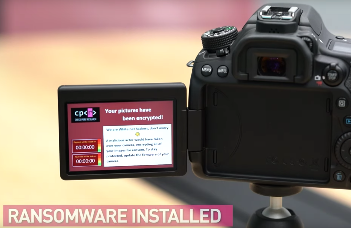 체크 포인트 리서치(Check Point Research)가 DSLR 카메라가 랜섬웨어 공격에 취약하다고 경고하고, 실제로 DSLR 카메라에 랜섬웨어 공격을 가하고 파일을 암호화하는 과정을 담은 영상을 공개했다. 테스트 영상에는 같은 무선랜(Wi-Fi) 환경에 연결된 DSLR 카메라에 노트북을 이용해 접근한 후, 랜섬웨어 공격을 통해 카메라에 저장되어 있던 사진을 암호화하는 장면이 담겨 있다.