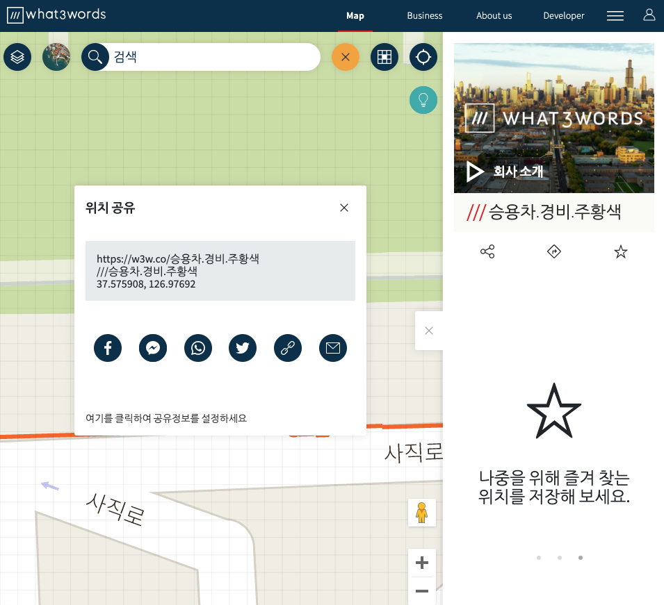앱 지도에서 위치를 확인하고, 공유할 수 있다. 공유할 위치 정보 형태는 웹링크, 3단어 위치, GPS 경위도 좌표 중에서 원하는 것이나 전부를 선택할 수 있다. 안드로이드나 iOS 앱을 스마트폰에 설치해서 위치를 확인하고 공유하는 것도 가능하다.