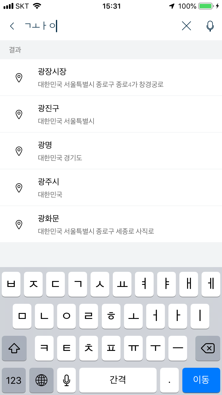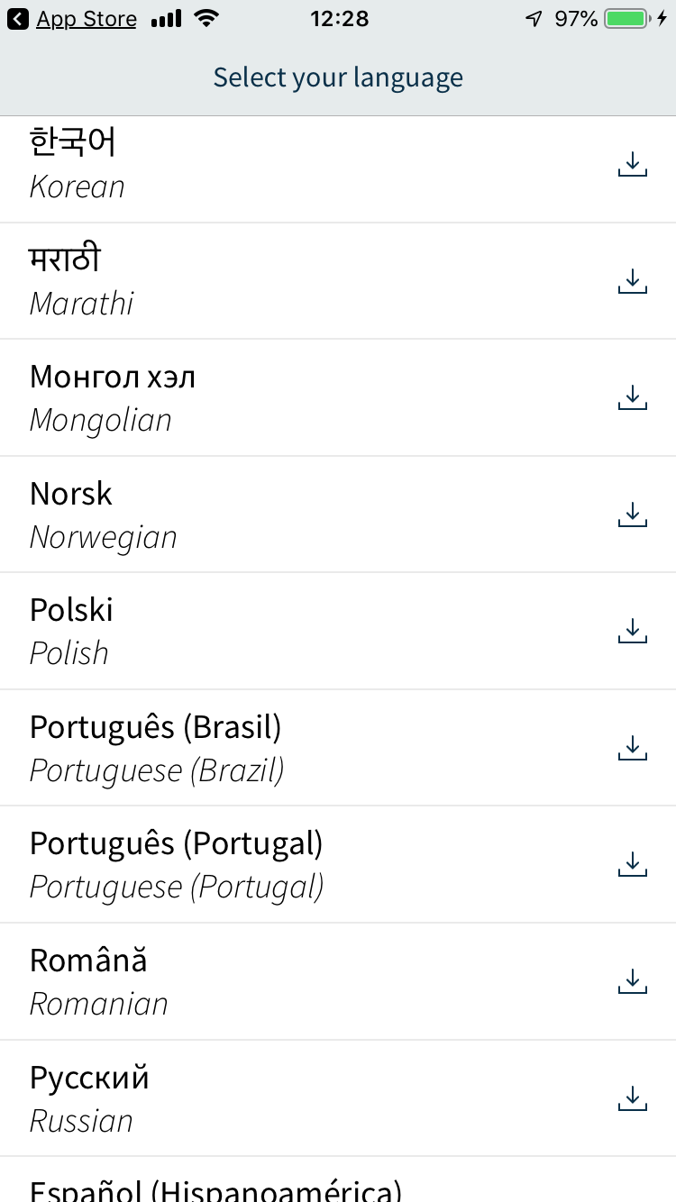 스마트폰에 앱을 설치한 후에는 사용할 언어팩을 선택해 다운로드 받아야 한다. 2019년 9월 5일 기준 42개 언어를 지원한다(왼쪽). 한글의 경우 iOS(ver 12.4.1)용 what3words(ver 4.1)의 경우, 한글 입력할 때 자음과 모음이 분리되는 버그가 있다(오른쪽).