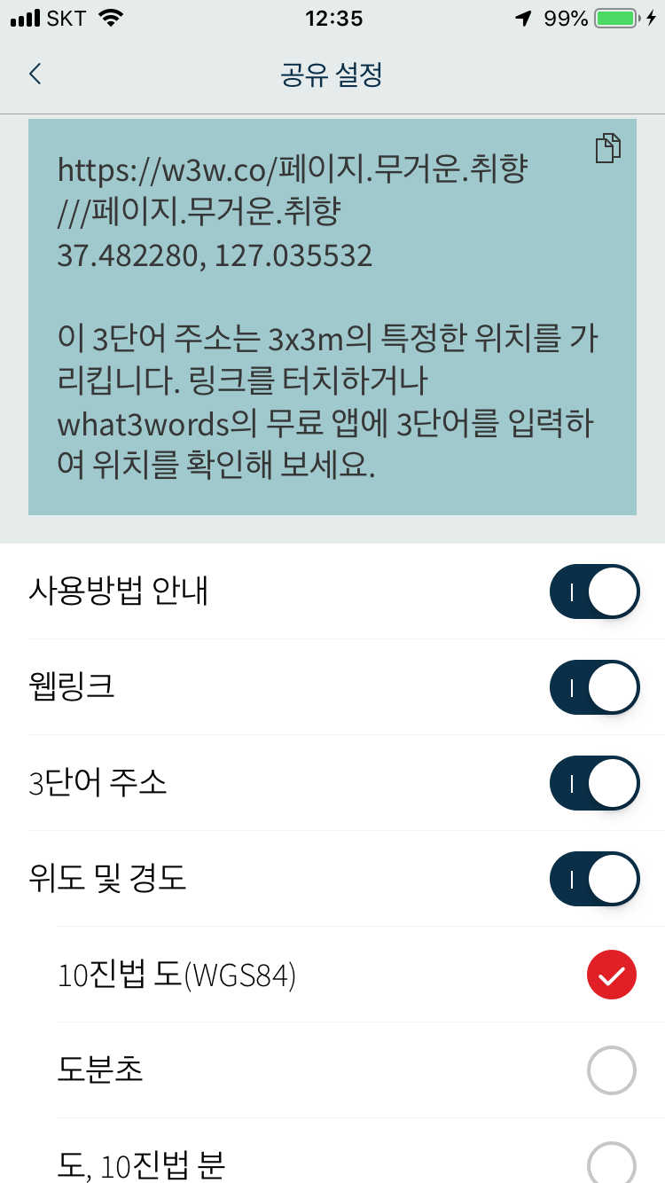 왓3워즈(what3words)는 이러한 상황에서 유용하게 사용할 수 있는 위치정보를 제공 서비스다. 3개 단어를 조합해 위치를 표시하기 때문에, 간편하고 빠르게 위치정보를 확인하고 공유할 수 있는 것이 장점이다. 위치를 공유할 때는 웹주소, 3단어 주소, GPS 좌표(위도와 경도)로 공유할 수 있다. 세 가지 주소를 모두 보낼 수도 있고, 하나 또는 두 가지만 보내도록, 공유 옵션에서 미리 지정해 두는 것도 가능하다.
