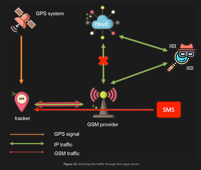 특히 이번 테스트에서 GPS 트래커의 웹 응용프로그램에서 생성되는 모든 요청이 암호화되지 않은 일반 텍스트로 전송되는 것을 발견했다. 게다가 전화 번호로 전화를 걸어 트래커의 마이크를 통해 도청을 하고, 해커가 장치의 전화 번호를 식별하여 인바운드 SMS 공격에 사용할 수 있는 SMS를 보내고, SMS를 이용해 클라우드 서버로 가야할 데이터를 가짜 서바로 라우팅하고, 트래커에 펌웨어를 설치해 기능을 바꾸거나 백도어를 설치할 수 있는 것으로 드러났다.