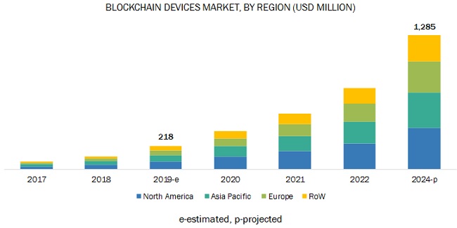마켓앤마켓의 블록체인 장치 시장 보고서는 2019년부터 2024까지 블록체인 장치 시장이 연평균 42.5% 증가할 것으로 내다봤다. 시장규모는 2019년 2억 1,800만(218 million) 달러에서 2024년 12억 8,500만(1,285 million)에 달할 것으로 예측했다. 다양한 산업과 지역에서 암호화 화페(Cryptocurrency)에 대한 관심과 수용이 증가하고 있는 것이 시장에 기회가 되고 있다고 밝혔다.