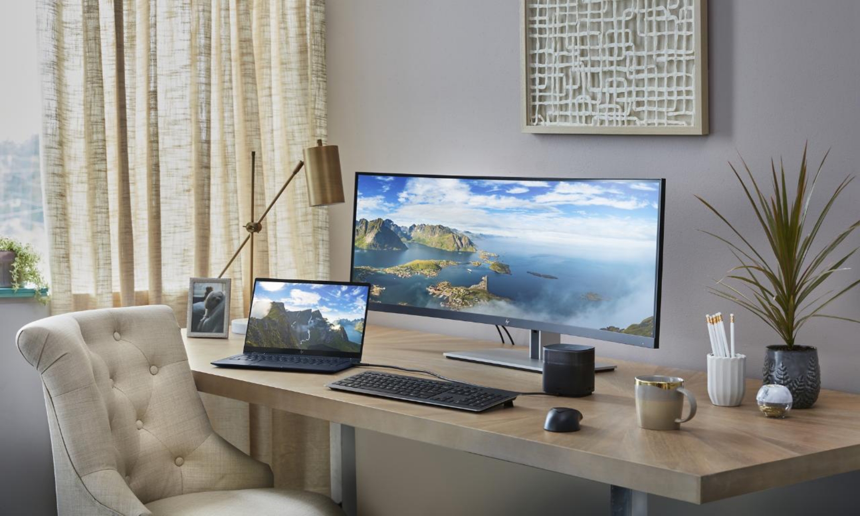 두 대의 시스템을 연결해서 사용할 수 있는, HP의 43.4인치 울트라 와이드 모니터 S430c. 화면을 두 개로 분할해 양쪽에 연결된 시스템 화면을 동시에 표시할 수 있고, 하나의 키보드와 마우스로 두 시스템을 제어할 수 있다. 두 대의 시스템 간 파일 드래그앤드롭도 가능하다.(사진:HP)