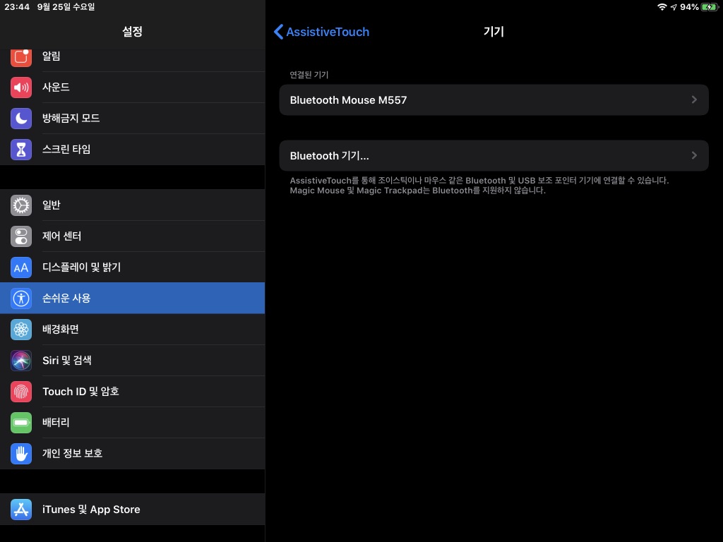 07 블루투스 마우스가 정상적으로 연결되었다면, 연결된 기기 항목에 마우스 이름이 표시되는 것을 볼 수 있다. 이제 화면 상단에서 ‘<AssistiveTouch’를 선택해 이전 메뉴로 돌아간다.