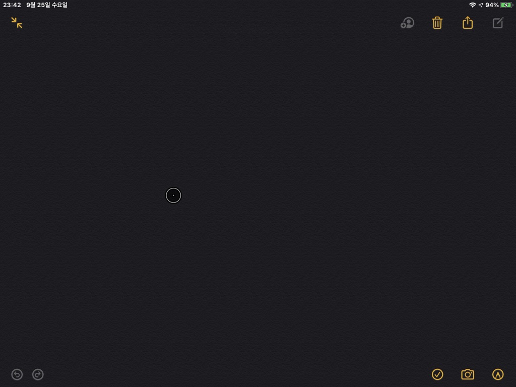 12 이제 바탕화면은 물론 어느 곳에서든지 동그라미 안에 작은 점이 찍힌 마우스 커서를 보고 사용할 수 있다. 마우스에 스크롤 버튼이 있다면 스크롤 기능도 지원한다. 화면은 다크 모드에서 메모장을 연 상태를 캡처한 모습이다.