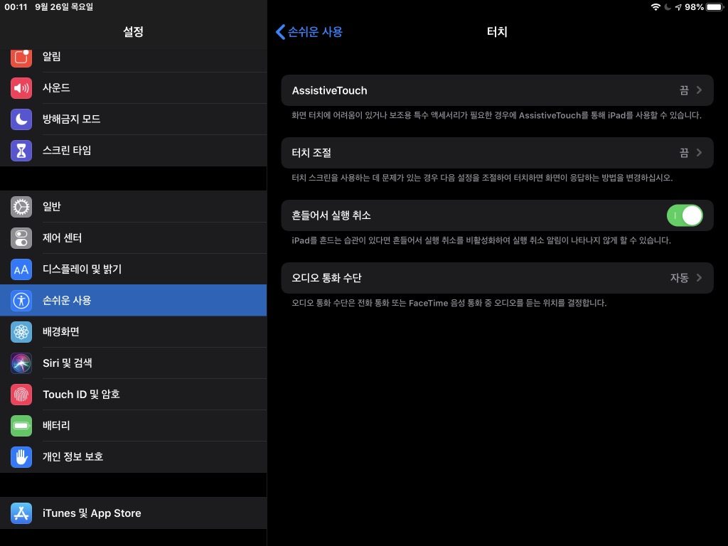 01 먼저 아이패드 설정 메뉴를 열고, 메뉴 목록에서 ‘손쉬운 사용’을 선택한다. ‘손쉬운 사용’에서 선택할 수 있는 기능 목록이 오른쪽에 표시되면, ‘신체 및 동작 지원’ 항목에서 ‘터치’ 찾아 선택한다.