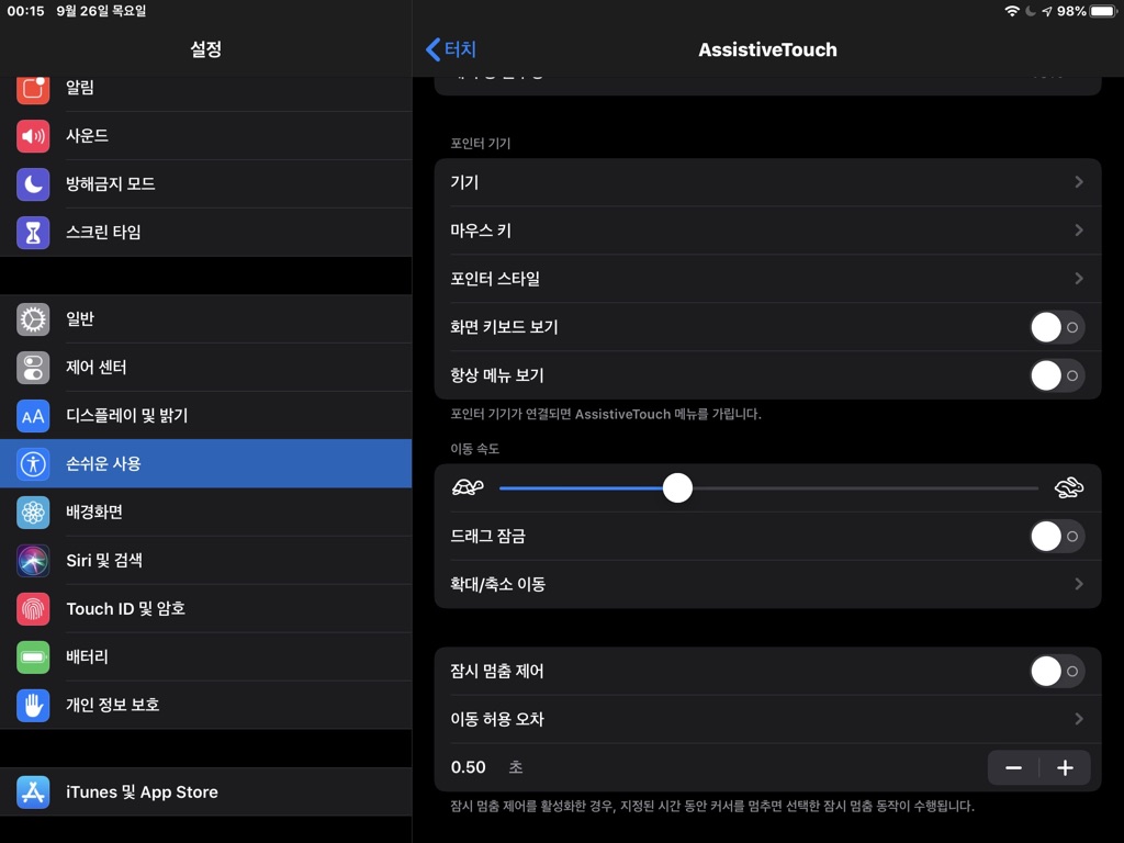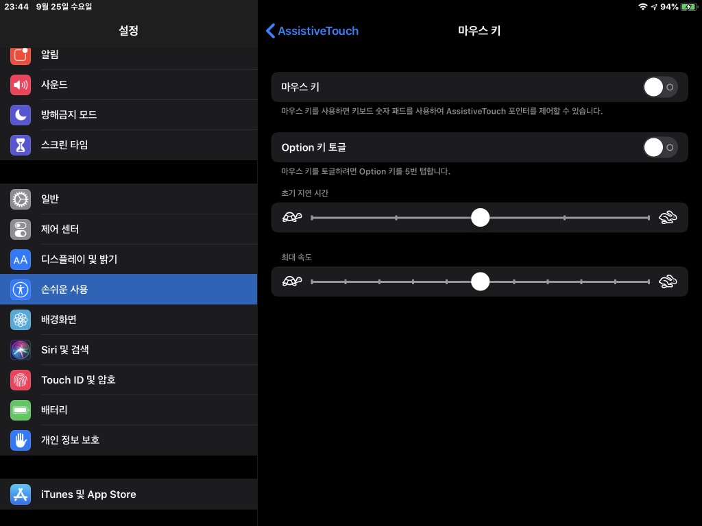09 ‘마우스 키’ 설정에서는 키보드 숫자 패드를 사용한 포인터 제어와 ‘옵션(Option) 키 토글’ 기능을 켜거나 끌 수 있다. 특별한 이유가 아니라면, 그냥 꺼 놓고 사용하면된다. 아래쪽에 있는 ‘초기 지연 시간’이나 ‘최대 속도’ 역시 기본 상태로 이용해 보면, 변경이 필요하면 그 때 조정하면된다. 상단의 ‘AssistiveTouch’를 터치해 이전 메뉴로 돌아간다.