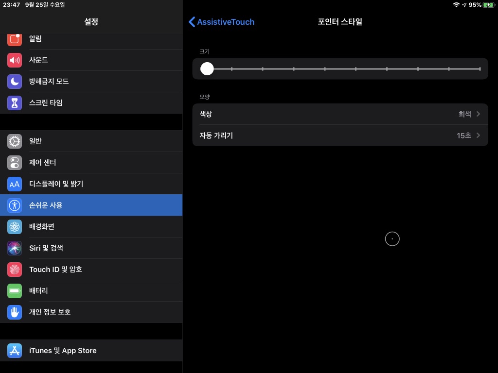 11 '포인터 스타일’에서는 포인터의 크기, 색상, 자동 가리기 시작을 선택할 수있다. 최대한 마우스와 비슷한 느낌으로 사용하려면 크기는 가장 작게 만들고, 색상은 7가지 중에서 선택할 수 있는데, 회색을 선택하면 가장 무난하다.
