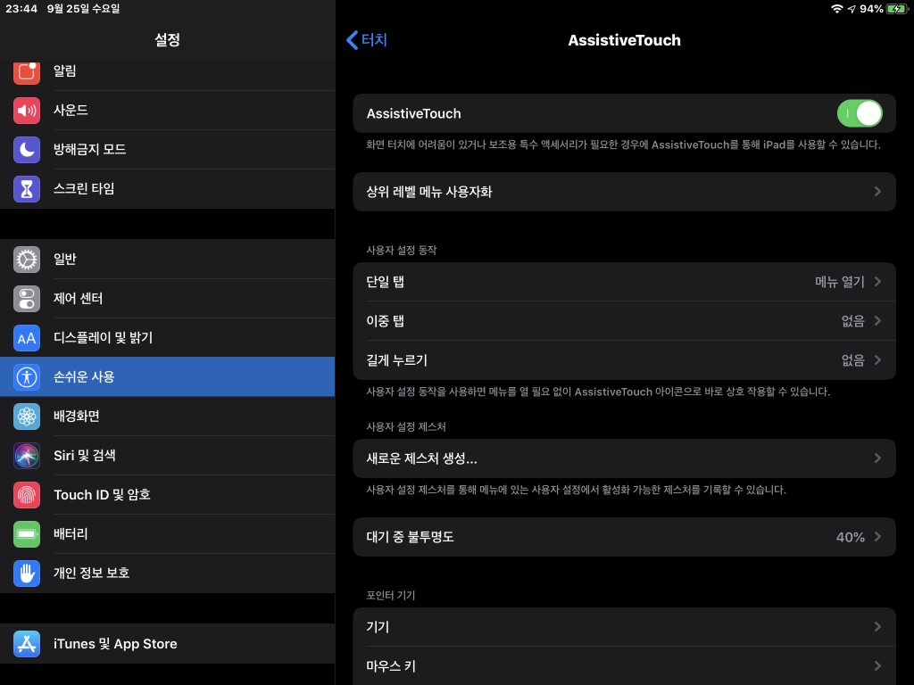 iPadOS 13.1에서 지원하는 마우스 기능은 화면 터치에 어려움이 있는 사용자를 위해 개발됐다. 그래서 활성화하고 설정하는 모든 메뉴와 기능이 ‘설정-손쉬운 사용’에 들어가 있다. 따라서 처음 마우스를 연결하고 기본 설정을 마치려면 ‘손쉬운 사용’을 통해 이루어진다.