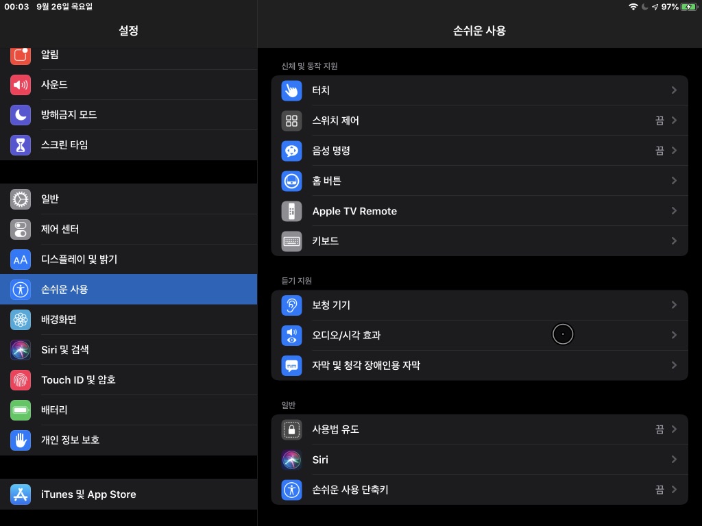 01 먼저 아이패드 설정 메뉴를 열고, 메뉴 목록에서 ‘손쉬운 사용’을 선택한다. ‘손쉬운 사용’에서 선택할 수 있는 기능 목록이 오른쪽에 표시되면, ‘신체 및 동작 지원’ 항목에서 ‘터치’ 찾아 선택한다.