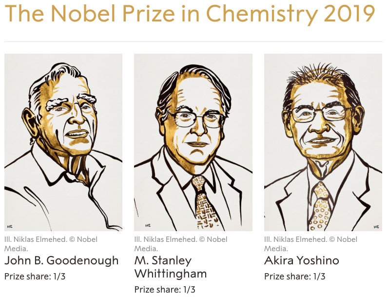 마침내 리튬 이온 전지(Battery)가 노벨상을 받았다. 2019년 노벨 화학상은 리튬 이온 전지를 개발, 연구, 발전시킨, 세 명의 과학자가 공동 수상하게 됐다. 스웨덴 왕립과학원 노벨상위원회는 존 구디너프(John B. Goodenough,97세) 미국 텍사스대 교수, 스탠리 휘팅엄(M. Stanley Whittingham,78세) 미국 빙엄턴대 교수(78), 요시노 아키라(Akira Yoshino,71세) 일본 메이조대 교수 겸 아사히 가세이 명예연구원(71세)이, 올해 노벨 화학상 수상자로 선정됐다고 10월 9일(현지 시간) 발표했다.