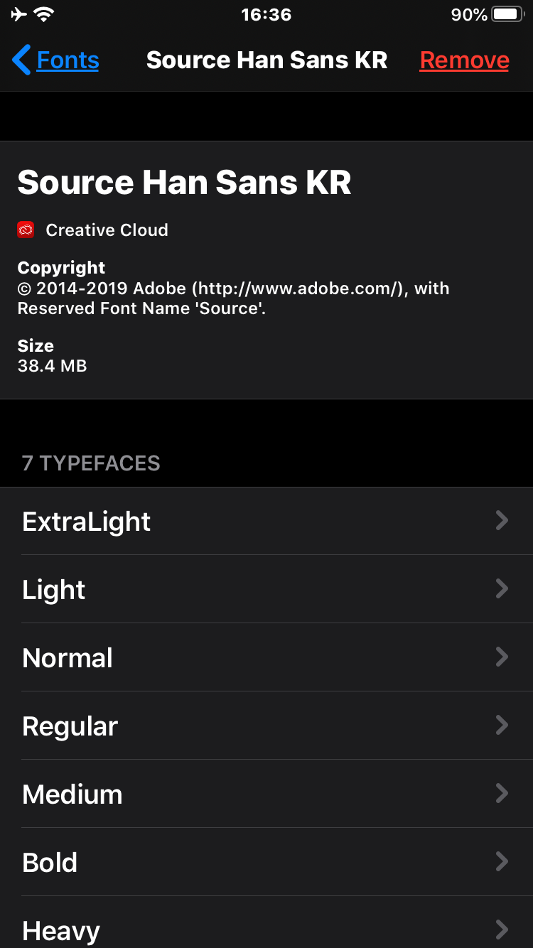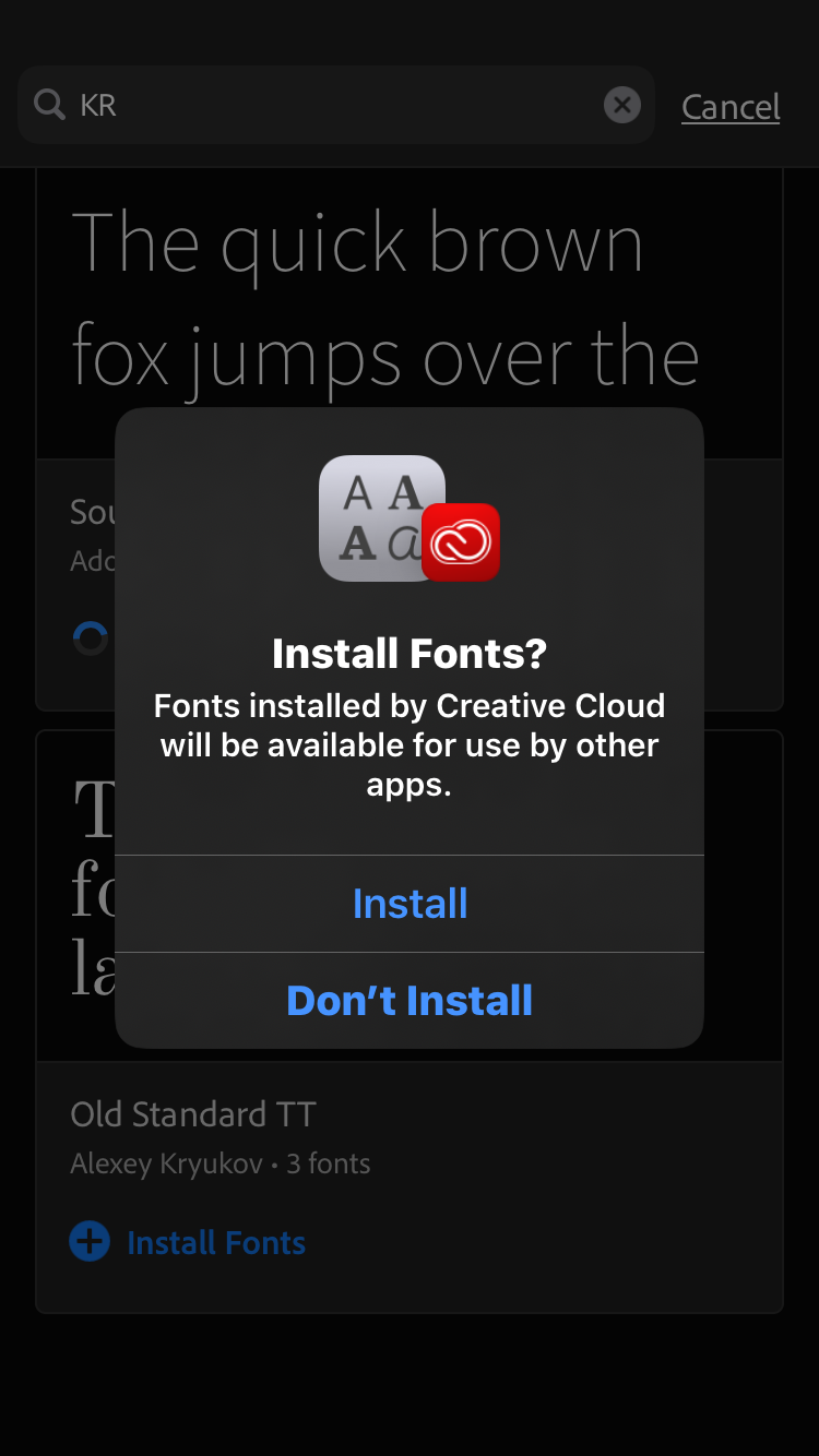 어도비 크리에이티브 클라우드 앱을 설치하고 실행하면, 어도비 폰트에 대한 안내와 다크 모드 지원 메시지를 볼 수 있다. 폰트 목록에서 원하는 글꼴을 선택한 후 ‘설치(Install)’ 아이콘을 터치하면, 간편하게 글꼴을 설치할 수 있다. 설치한 글꼴은 아이폰 설정-일반-서체에서 확인 및 삭제가 가능하다.