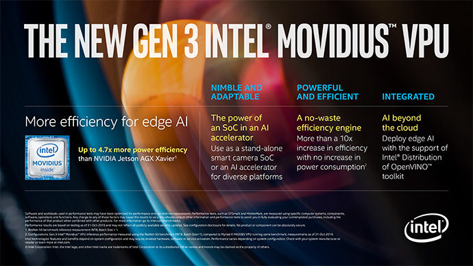2020년 상반기에 출시될 차세대 인텔 모비디우스 VPU(Vision Processing Unit)는 효율적인 아키텍처 기술을 통합해, 경쟁사 프로세서보다 최고 6배 우수한 전력 효율성과 이전 세대보다 10배 이상 높은 추론 성능을 제공할 것으로 예상한다고 인텔은 밝혔다. 또한 인텔 오픈 비노(OpenVINO) 툴킷 디스트리뷰선과 함께 엣지용 인텔 데브클라우드(DevCloud)를 발표해, 개발자들이 하드웨어를 구매하기 전에 광범위한 인텔 프로세서 기반에서 AI 솔루션을 시도하며, 테스트하고 프로토타입화할 수 있도록 지원할 계획이다.