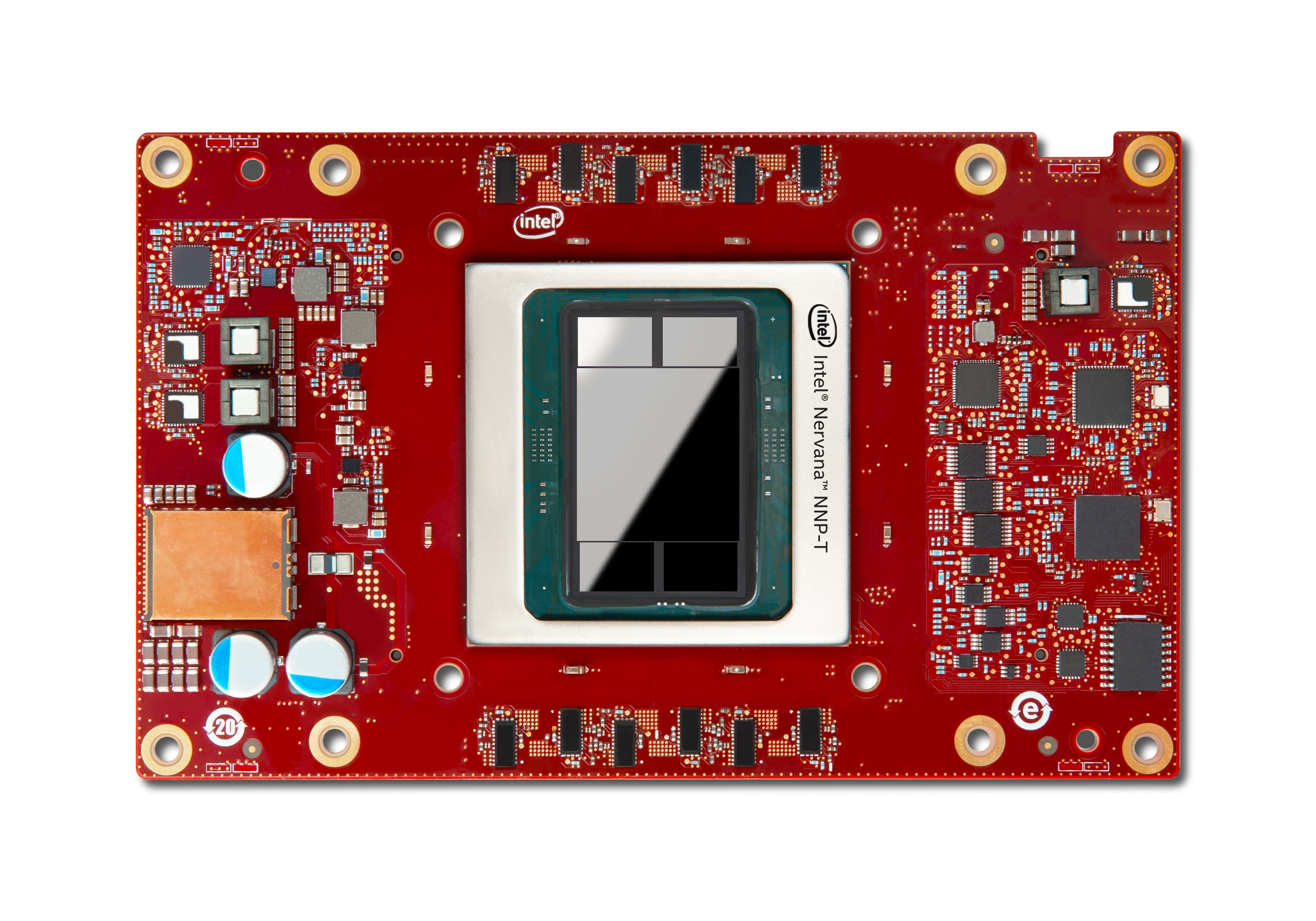 학습용 인텔 너바나 NNP-T, 메 자닌 카드. 인텔 NNPT는 클라우드 및 데이터 센터 고객을위한 규모와 효율성을 갖춘, 복잡한 딥 러닝을위한 인텔 최초의 특수 목적 ASIC이다. 인텔은 2019년 11월 12일(현지 시간) 샌프란시스코에서 열린 AI 회의에서 인텔 NNP를 시연했다.(사진:인텔)