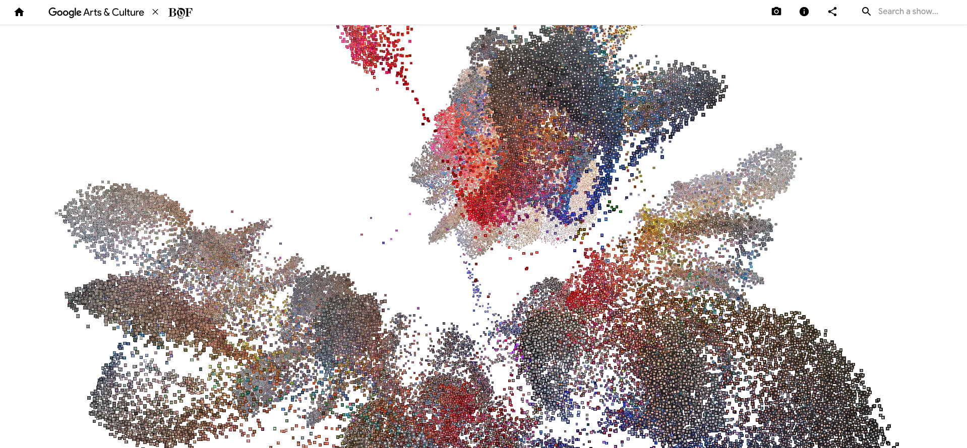 이렇게 색상 팔레트로 시각화한 데이터를 활용해, 전 세계 패션 위크에서 나오는 색상, 디자이너, 계절 및 트렌드를 탐색할 수 있다. 따라서 2017년 가을에는 어떤 색상이 유행했는지, 그때 디자인 트렌드는 어떠했는지를, 또 다른 형태의 패션쇼를 보는 것처럼 편리하고 쉽게 알아볼 수 있다. 만약 인공지능의 도움이 없었다면, 이러한 방법으로 패션 데이터를 분류하는 것이 가능했을까 하는 생각을 갖게 될 정도로, 방대한 데이터와 시각화해서 데이터로 만든 색상 정보가 돋보이는 프로젝트다.