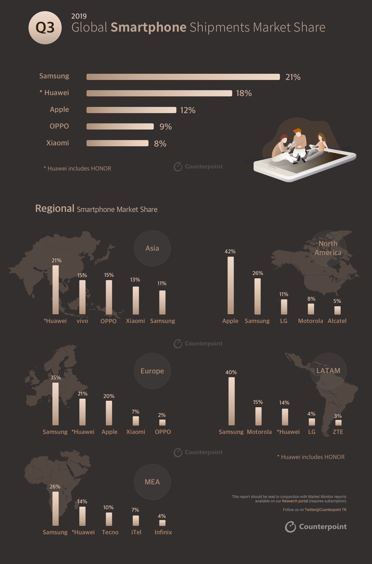 카운터포인터리서치가 ‘2019년 3분기 모바일 마켓 모니터 인포그래픽(INFOGRAPHIC: Q3-2019 | MOBILE MARKET MONITOR)’ 보고서를 발표했다. 글로벌 시장 1위는 삼성이 올랐으며, 그 뒤를 화웨이, 애플, 오포, 샤오미가 이었다. 유럽, 라틴아메리카, 중동에서는 삼성이 1위, 아시아에서는 화웨이가 1위, 북미에서는 애플이 1위로 시장을 선도하고 있다(자료:카운트포인트리서치)