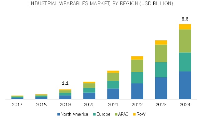 산업용 웨어러블 시장이 2019년부터 2024년까지 50.2%의 연평균 복합성장률을 기록하며 빠르게 성장할 것이라는 전망이 나왔다. 마켓앤마켓은 ‘산업용 웨어러블 글로벌 시장 보고서(Industrial Wearables Market - Global Forecast to 2024)’를 통해, 2019년 11억 달러로 예상되는 산업용 웨어러블 시장 규모가 2024년이 되면 86억 달러로 가파르게 성장할 것으로 예측했다.