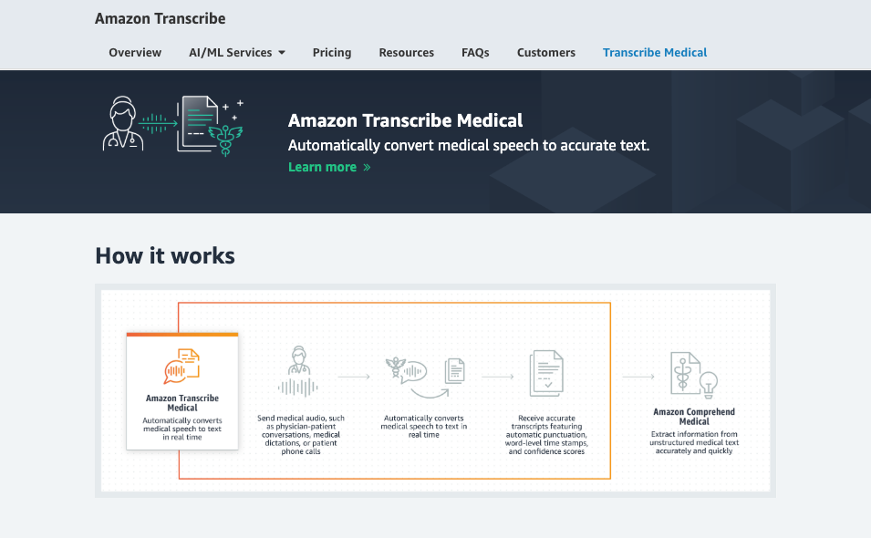 AWS(Amazon Web Services)가 의료 분야에 특화된 기계학습 자동 음성인식(ASR;Automatic Speech Recognition) 서비스인 '아마존 트랜스크라이브 메디컬(Amazon Transcribe Medical, 이하 ATM)’을 출시했다. ATM은 AWS가 기존에 제공해 오던 아마존 트랜스크라이브를, 의학전문용어까지 인식하고 문자로 변환할 수 있도록 확장한 관리형 서비스다.