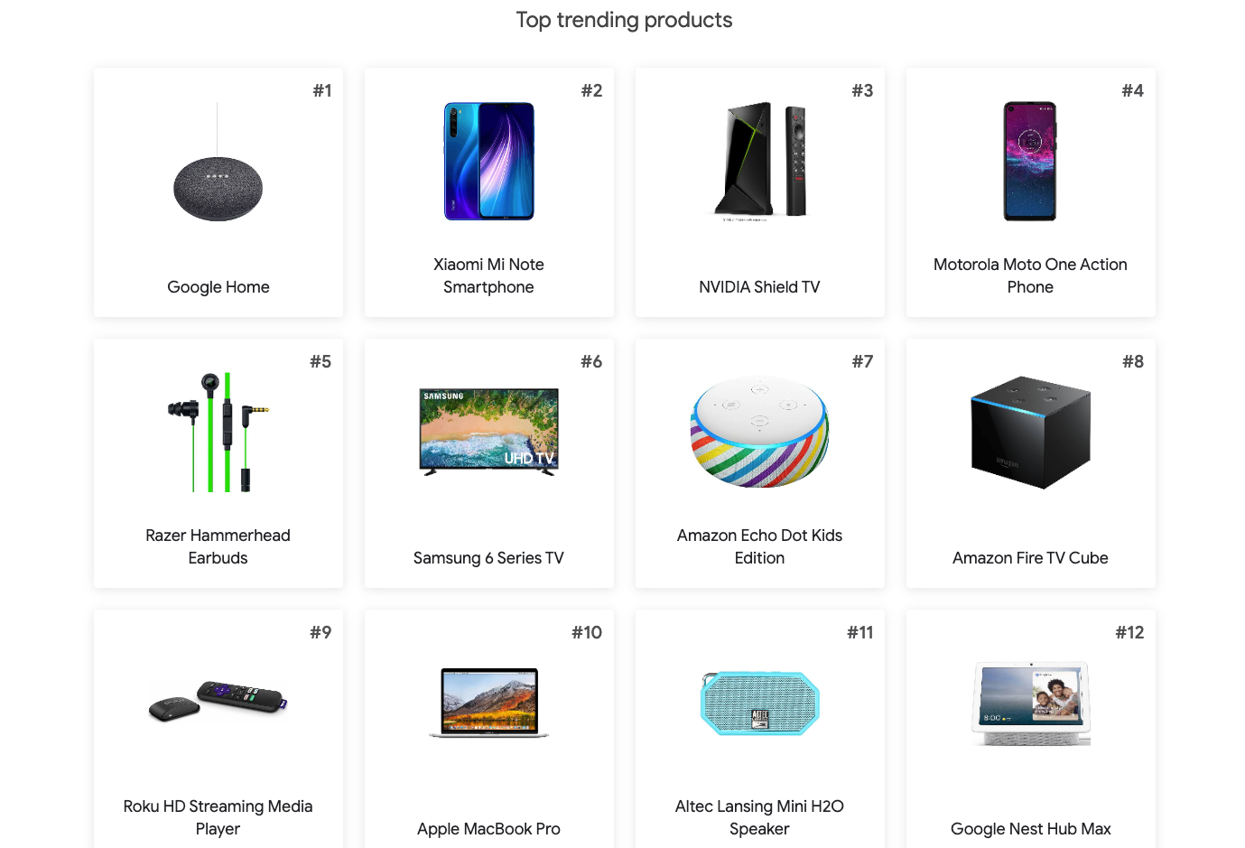 예를 들어 기술(Tech) 카테고리에서 1위는 구글 홈, 2위는 샤오미 미 노트(Xiaomi Mi Note), 15위는 아마존 킨들 파이어 HD7 키즈 에디션(Amazon Kindle Fire HD 7 Kids Edition)이다. 주방용품에서는 1위 닌자 푸디 압력솥(Ninja Foodi Pressure Cooker), 10위 월풀 식기 세척기(Whirlpool Dishwasher), 13위는 브레빌 주서기(Breville The Juice Fountain Cold Juicer)가 이름을 올리고 있다.