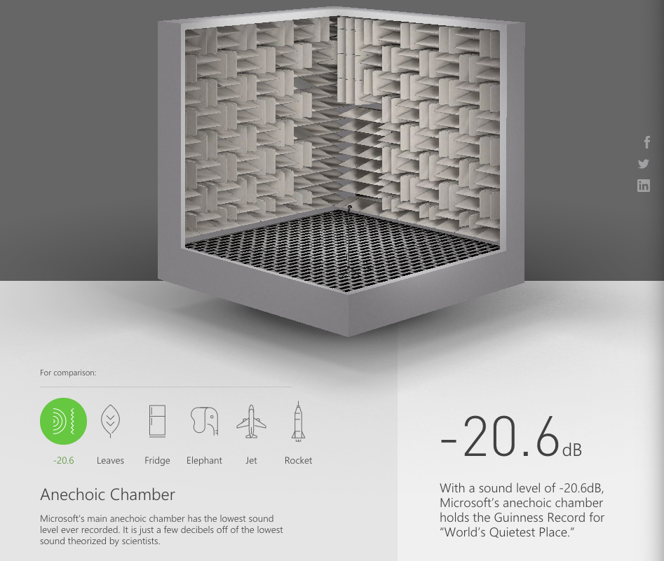 첫 번째 숫자 ’20.6'은 -20.6dB(데시벨)을 의미한다. 외부 소음을 모두 차단하는 마이크로소프트의 무향실은 -20.6dB이라는 사운드 레벨을 기록했다. 이 기록은 기네스 북에 세상에서 가장 조용한 곳으로 이름을 올리기도 했다. 참고로 나뭇잎을 조용하게 스치는 바람 소리는 20dB, 냉장고 소리 40dB, 코끼리가 지르는 소리는 112dB, 제트기가 이륙할 나오는 엔진 소음은 150dB, 로켓 발사 때의 소리는 무려 220dB에 달한다는 설명이 곁들여 있다.