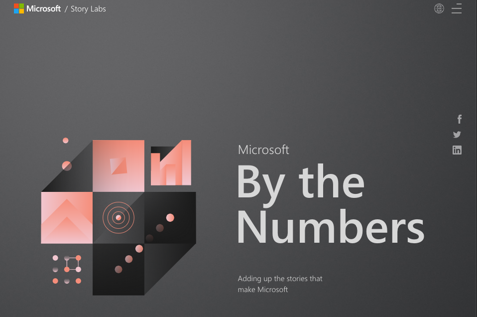 마이크로소프트가 스토리 랩을 통해 공개한 숫자로 보는 마이크로소프트에는 13개의 항목으로 구성된 마이크로소프트 이야기가 담겨 있다. 스토리 중에는 기네스북에 오른 세계에서 가장 조용한 무향실, 윈도 10이 구동되는 장치 수, 코타나가 받은 질문의 수 등으로 구성되어 있다.(화면:마이크로소프트 스토리 랩)
