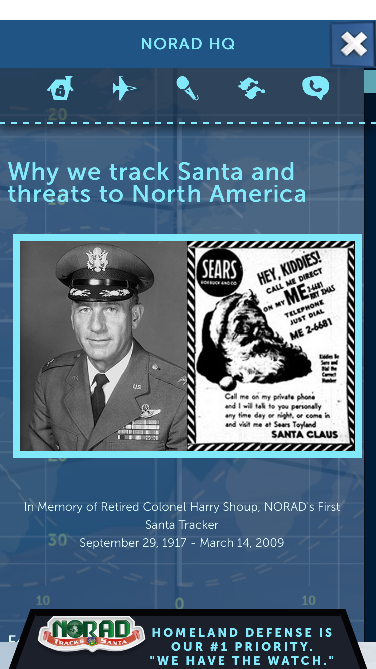 극장에는 노라드 산타 트래커에 대한 동영상을 보여준다. 크리스마스를 준비하는 자원봉사자들, 노라드의 현역 군인들, 노라드의 임무, 선물을 받고 좋아하는 아이들, 군인들의 근무 모습, 그들의 임무 등이 어우러지며 잔잔하면서 야릇한 감동을 준다. 군인들이 등장하는 작전 상황과 아이들의 해맑은 웃음, 접점을 찾기 쉽지 않아 보이지만 평화의 소중함을 잔잔하게 전달한다.
