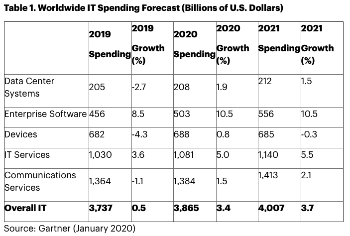 가트너가 ‘2020년 글로벌 IT 지출 예측’이라는 리포트를 발표했다. 데이터 센터 시스템(Data Center Systems), 엔터프라이즈 소프트웨어(Enterprise Software), 디바이스(Devices), IT 서비스(IT Services), 통신 서비스(Communications Services) 분야로 나누고, 각각의 분야에서 예상되는 지출과 성장률을 발표했다.