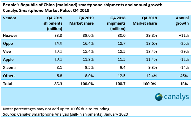 2019년 4분기 중국 스마트폰 출하량은 8,530만대로, 2018년 같은 기간과 비교할 때 15% 감소한 것으로 집계됐다. 업체별 시장 점유율(Market Share)은 화웨이가 1위(39%), 오포가 2위(16.4%), 비보가 3위(15.4%), 애플이 4위(11.8%), 샤오미가 5위(9.5%)를 기록했다. 화웨이는 전년 같은 기간과 비교할 때 연간 성장률(annual growth)이 11% 상승했고, 나머지 업체들은 모두 마이너스 성장을 기록했다.
