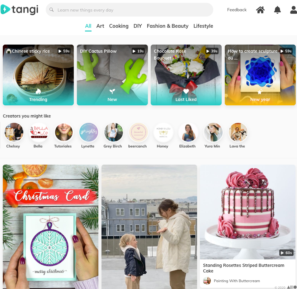 60초 이하의 짧은 동영상으로 ‘DIY’ 내용을 공유하는 소셜 비디오 공유 서비스 탄지. 구글의 사내 벤처 지원 프로그램인 에이리어 120이 지원하는 실험적인 프로젝트로, ‘재미’가 아닌 ‘학습’에 초점을 맞춰 차별화를 시도했다.(화면:tang.co)