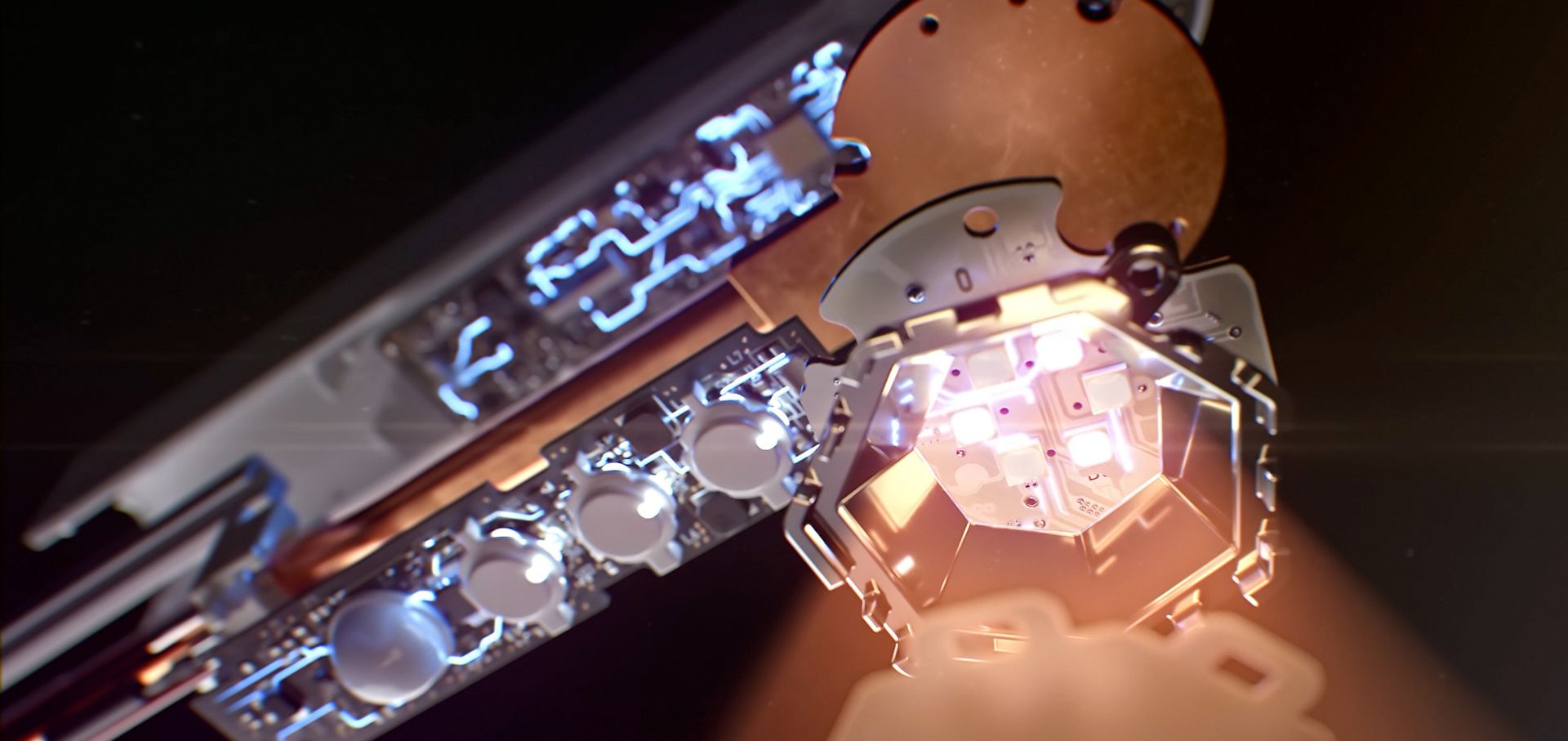 무드 조명을 구현한 방식도 '마그네틱 터치 글라이드 도킹’이라는 다이슨다운 방법을 적용했다. 헤드부분을 지지대 쪽으로 가져가 살짝 밀면, 내장된 자석에 의해 자연스럽게 헤드 부분이 지지대와 결합한다. 이렇게 전구와 지지대가 자석으로 연결되면, 지지대에 뚫린 0.7mm 깊이의 1만 6,740개의 작은 구멍을 통해, 오렌지색 불빛이 은은하게 스며 나온다. 알루미늄으로 만들어진 지지대 안쪽에는 전기를 공급하는 전선이 지나는데, 이러한 빛의 진행을 방해하지 않도록 투명한 초박형 케이블을 사용했다.