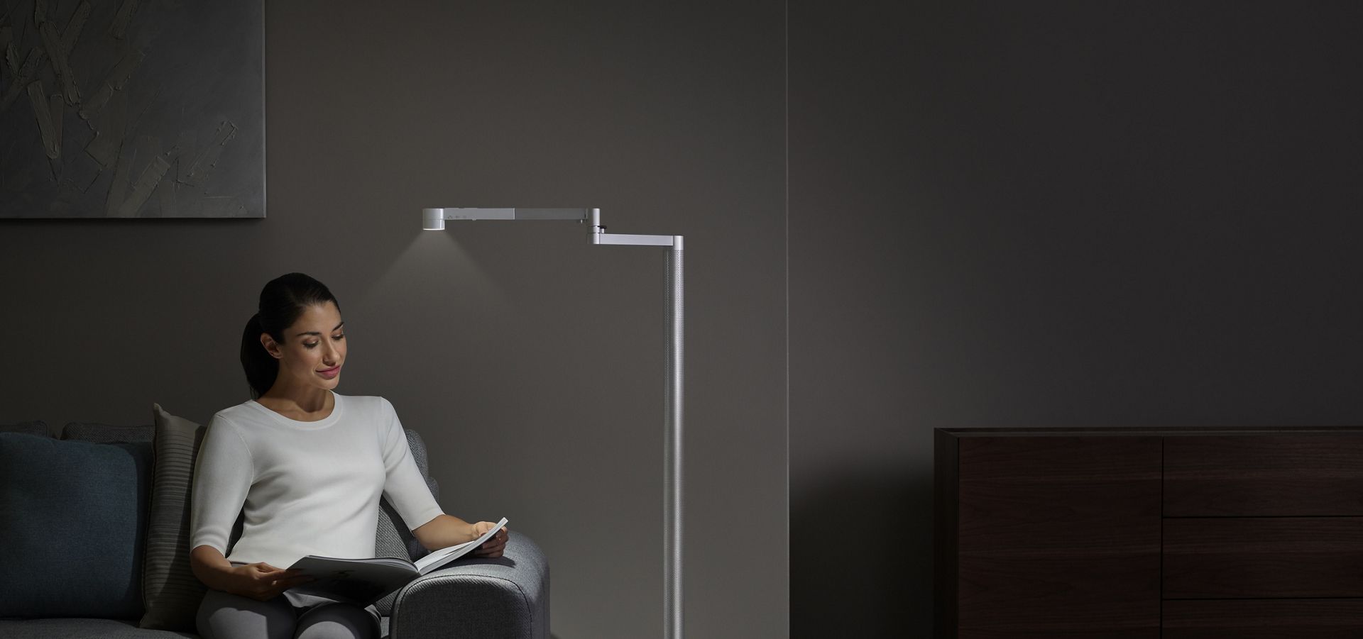 간접 조명(Indirect light)은 회전하는 헤드부분을 천장, 벽, 바닥 등을 비출 때 활용한다. 작업 조명(Task light)은 책을 보거나 일을 할 때, 밝고 충분한 양의 빛이 필요할 때 사용한다. 전시 조명(Feature light)은 그림이나 인테리어 소품처럼 특별하게 강조하고 싶은 물건이나 위치가 있을 때 유용하다. 무드 조명(Ambient light)은 마치 촛불처럼 따스하고 은은한 오렌지 불빛과 함께 휴식을 취하고 싶을 때 요긴하다.