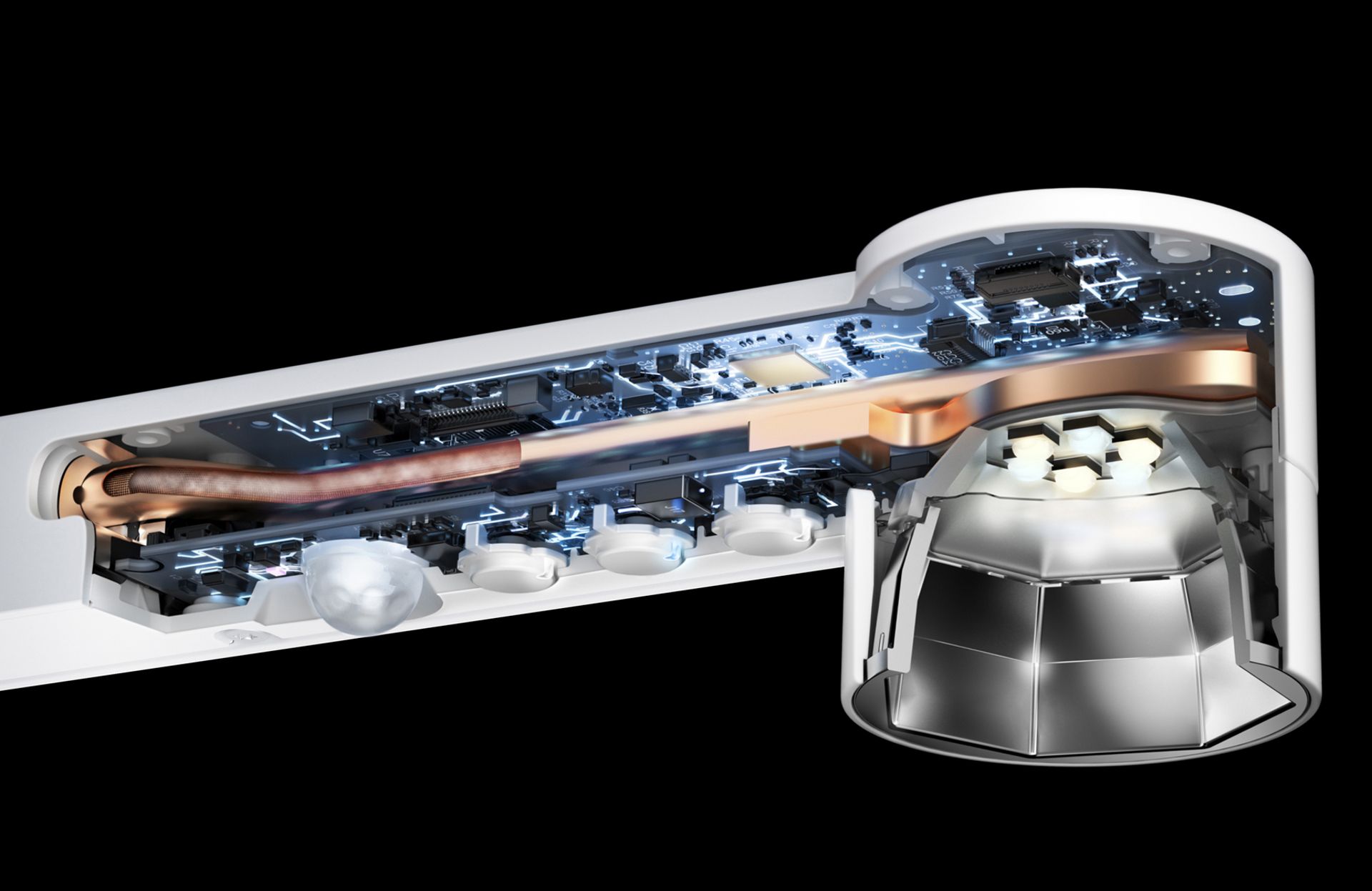 라이트사이클 모프는 따뜻한 색과 차가운 색 온도의 빛을 내는 각각 3개의 LED 전구를 사용해, 색온도와 빛의 양을 필요에 따라 자유롭게 조절할 수 있다. 진공 상태로 밀봉된 구리관에 채운 물로 전구에서 발생한 열을 냉각시키는 히트 파이프 기술을 적용해, 전구 수명을 최대 60년까지 늘렸다. (사진:Dyson)