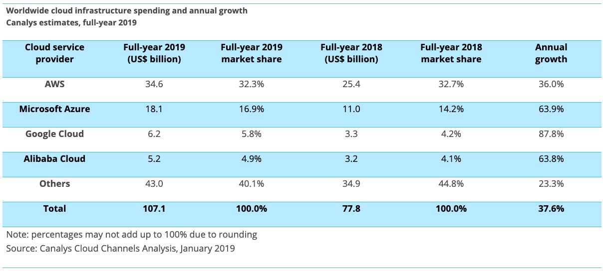 카날리스가 2019년 클라우드 채널 분석 보고서를 발표하고, 2019년 클라우드 서비스 시장이 1,071억 달러의 지출 규모를 달성하며, 37.6%의 연평균 성장률을 기록한 것으로 추정했다. AWS를 선두로 마이크로소프트 애저, 구글 클라우드, 알리바바 클라우드가 전체 시장의 59.9%를 차지하고 있다. (자료:Canalys)