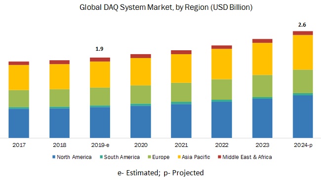 마켓앤마켓이 이러한 데이터 수집 시장의 성장 규모와 전망을 가늠할 수 있는, ‘2024년까지 데이터 수집 시스템(DAQ;Data Acquisition System) 글로벌 시장 전망’ 보고서를 발표했다. 보고서는 데이터 수집 시장의 예상 매출 규모가 2019년 19억 달러에서 2024년까지 26억 달러로 성장할 것으로 추정했다. 이 기간 연평균복합성장률(CAGR;Compound Annual Growth Rate)는 약 5.9%에 이를 것으로 예측했다.