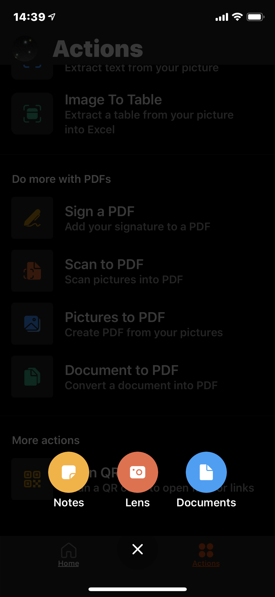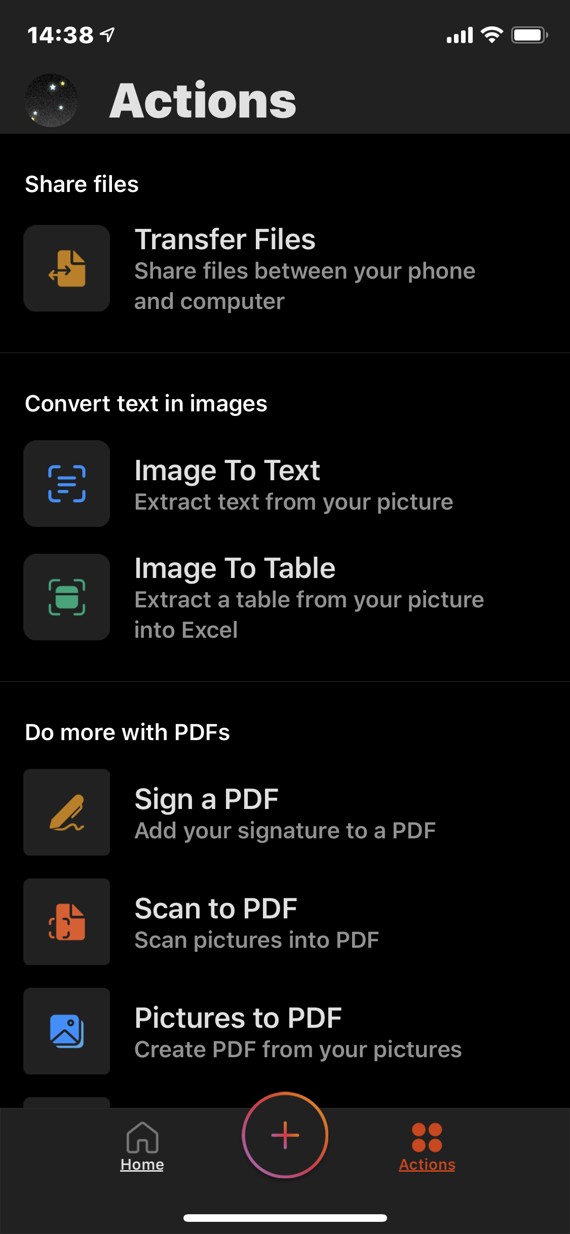 세 번째는 빠른 메모 작성을 비롯해 다양한 새로운 기능이 추가됐다. 새로 추가된 기능은 오피스 앱 하단에 있는 ‘액션(Action) 아이콘을 선택하면 나타난다. 현재 액션 메뉴에서는 파일 전송(Transfer Files), 이미지를 텍스트로 변환(Image To Text), 이미지를 표로 변환(Image To Table), PDF에 서명하기(Sign a PDF), PDF로 스캔하기(Scan to PDF), 사진을 PDF로 만들기(Pictures to PDF), 문서를 PDF로 만들기(Document to PDA), QR 코드 스캔(Scan QR Code)을 사용할 수 있다.