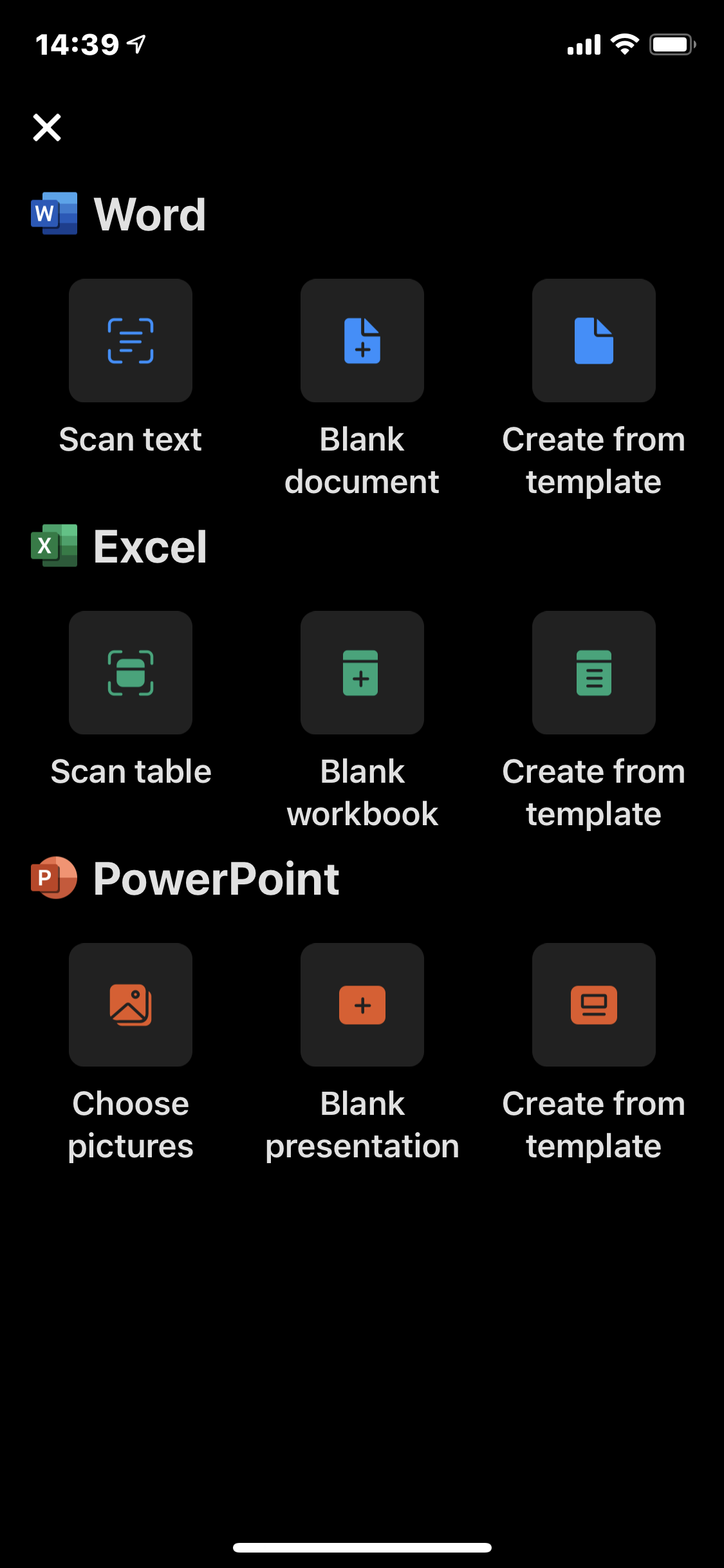스마트폰용 ‘마이크로소프트 오피스’ 앱을 사용하면, 워드, 엑셀, 파워포인트 문서를 하나의 앱으로 모두 사용할 수 있다. 아울러 파일 전송, 이미지를 PDF나 텍스트로 변환, 빠른 메모 작성 등의 부가 기능도 활용할 수 있다. (사진: iOS 오피스 앱 캡처)