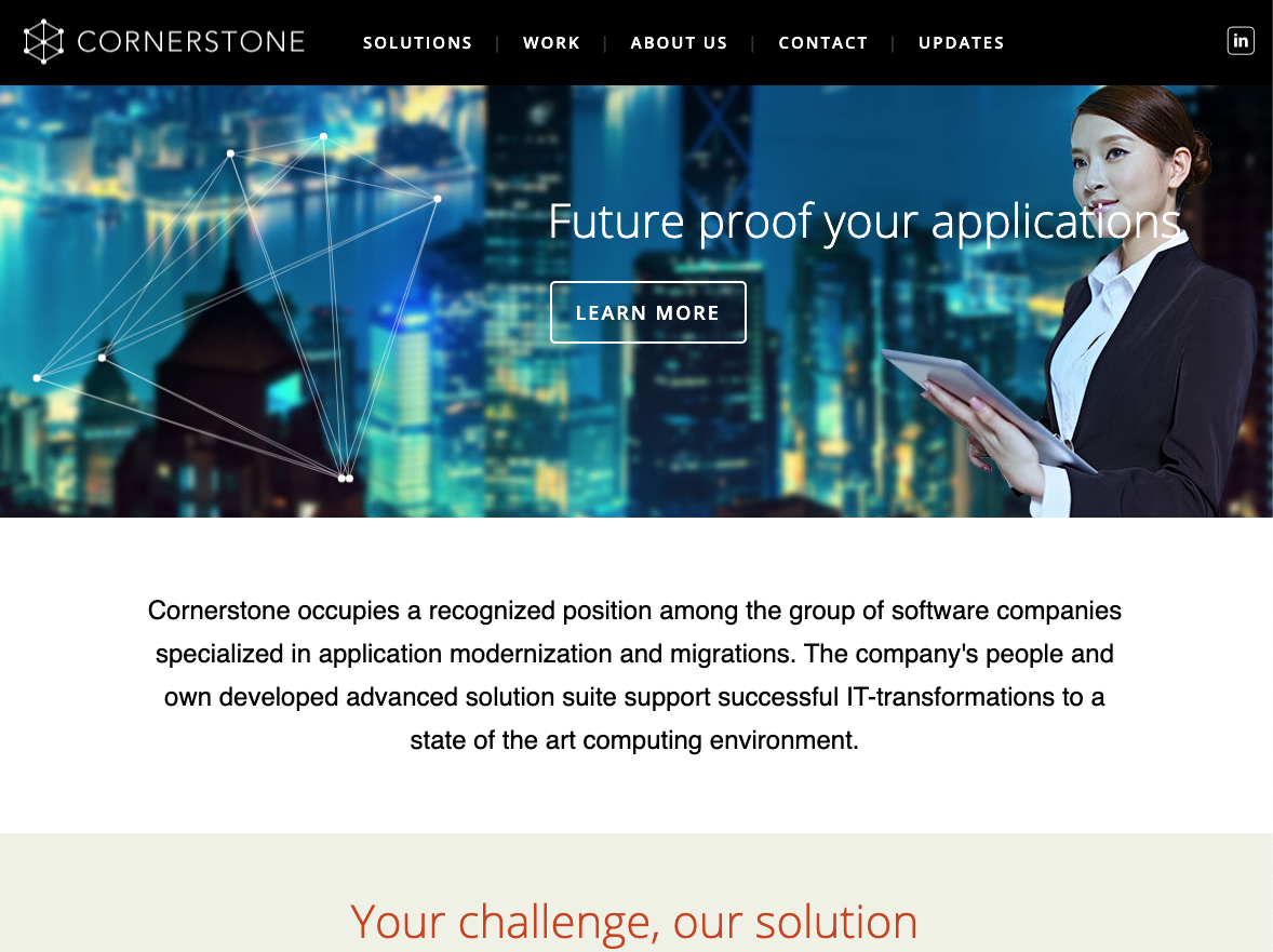 구글이 2월 20일 인수를 발표한 품질 측정, 소프트웨어 분석, 응용 프로그램 마이그레이션 전문업체인 네덜란드의 코너스톤(Cornerstone)의 홈페이지. 구글 클라우드는 앞으로 코너스톤의 마이그레이션 솔루션을 활용해, 고객들이 메인 프레임에서 클라우드로 빠르고 효율적으로 마이그레이션 할 수 있도록 지원할 예정이다. (화면:CONRNERSTONE 홈페이지)