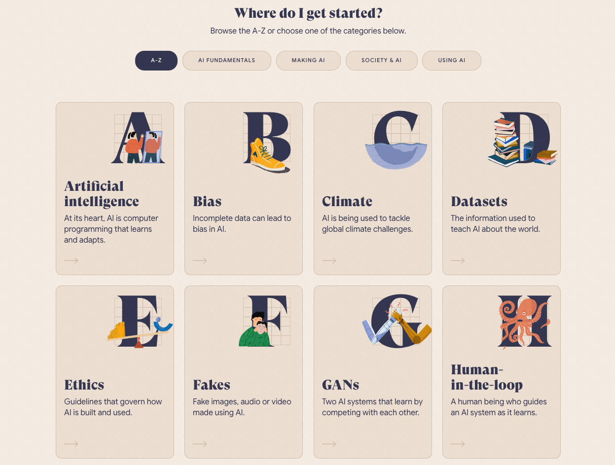 어느 순간 AI(Artificial Intelligence)가 일상적인 단어가 됐다. AI를 어디서나 쉽게 보고 듣는 세상이다. 하지만 실제로 AI가 우리 일상과 업무 속에서 무엇을 하고 있는지, 얼마나 가깝게 있는지 모르고 있는 사람도 적지 않다. AI에 대해 알아야 하거나 알고 싶은 것들이 있다면, 인공지능의 A-Z 홈페이지를 방문하면 된다. 알파벳 순서대로 나열된 키 문자를 선택해도 되고, AI의 기초, AI 제작, 사회와 AI, AI 활용으로 구분된 카테고리로 들어가도 된다.