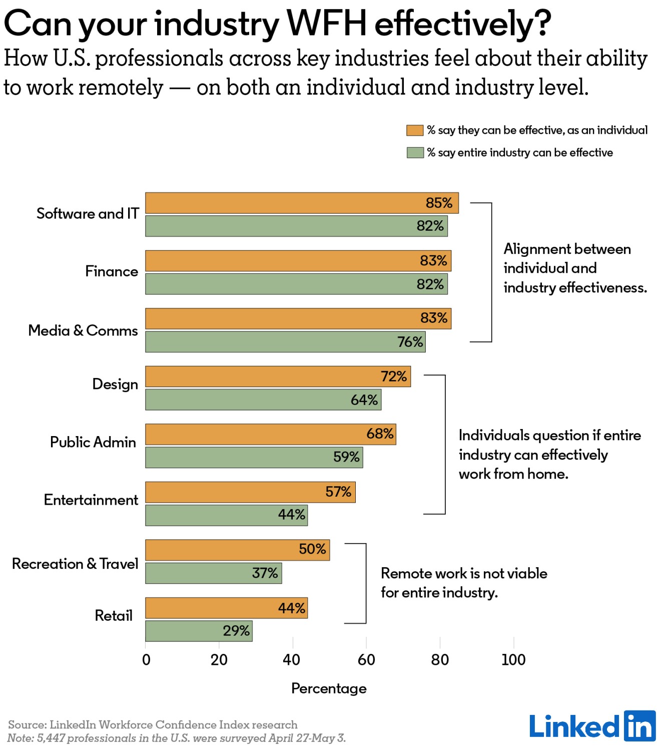 근로자 신뢰 지수는 미국에 기반을 둔 링크드인 회원 중에서, 학생이나 퇴직자를 제외하고 직업이나 직장을 가진 회원을 무작위로 선정해 진행한다. 이번 조사는 2020년 4월 27일부터 5월 3일까지 링크드인 회원 5,447명을 대상으로 이메일 설문 조사를 실시했다. 근로자 신뢰 지수 조사는 2주마다 다른 주제로 진행되며, 이번에는 '개인과 산업 분야로 나누어 재택근무가 얼마나 효과적이라고 생각하는가’를 물어봤다.