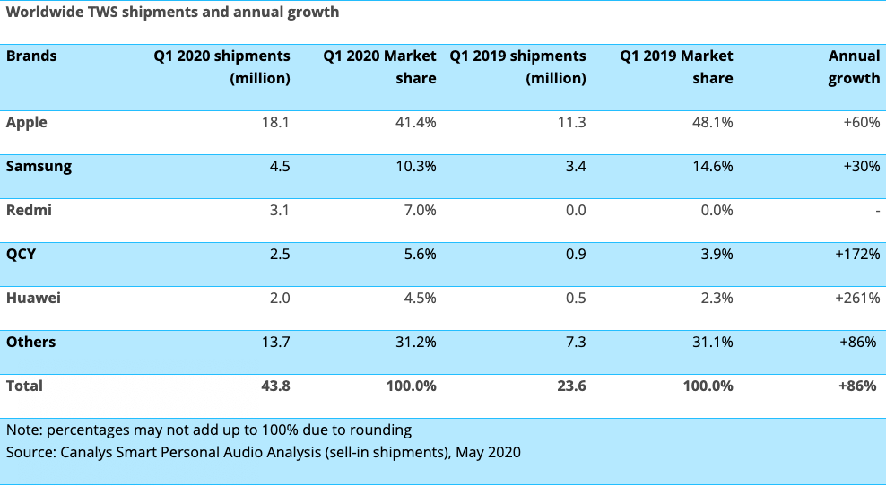 3위부터 5위까지는 모두 중국 기업이 올랐다. 3위는 샤오미의 브랜드 중 하나인 레드미(Redmi)가 310만대 출하를 기록하며 7%의 시장을 점유했고, 4위는 QCY가 250만대로 5.6%의 시장을 확보했다. 5위인 화웨이는 200만대를 출하하며 4.5%의 시장 점유율을 기록했다. 1위부터 5위까지 브랜드가 전체 TWS 시장의 68.8%를 차지하고 있다.