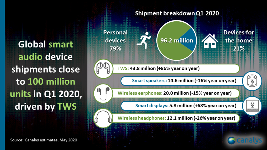 카날리스(Cynalys)가 스마트 스피커와 개인용 오디오 장치 등으로 이루어진 ‘스마트 개인 오디오 분석(Smart Personal Audio Analysis (sell-in shipments))’보고서를 발표했다. 보고서는 2020년 1분기 전 세계 스마트 오디오 장치의 출하량이 9,620만대를 기록한 것으로 추정했다.