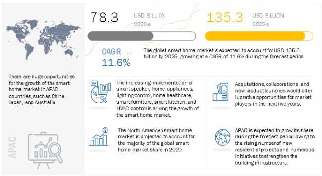 마켓앤마켓이 발표한 ‘코로나19에 의한 스마트홈 시장 영향 분석’ 보고서에 따르면, 스마트홈 시장에 2025년까지 연평균 11.6%의 성장률을 기록하며 1,353억 달러의 시장으로 성장할 전망이다.( 자료:마켓앤마켓)
